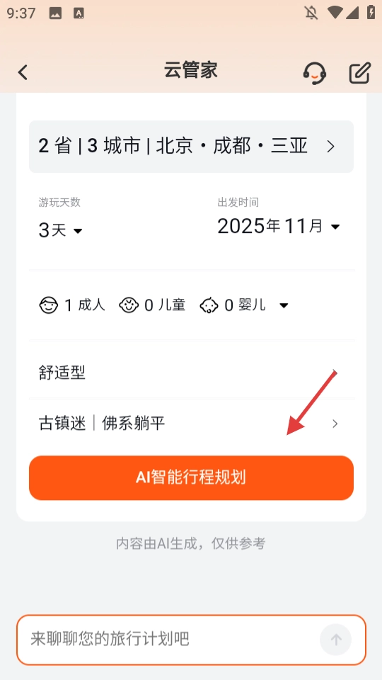 完成信息设置后,点击【AI智能行程规划】按钮,提交行程规划请求。