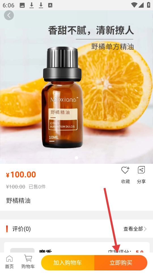 在商城首页找到【野橘精油】的商品卡片并点击,即可进入该商品的详情页面。