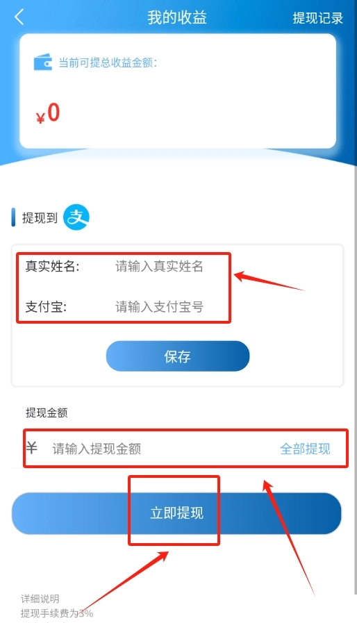 登录成功后,进入“我的收益”板块,填写并保存支付宝账号,输入提现金额,最后点击“立即提现”按钮即可。