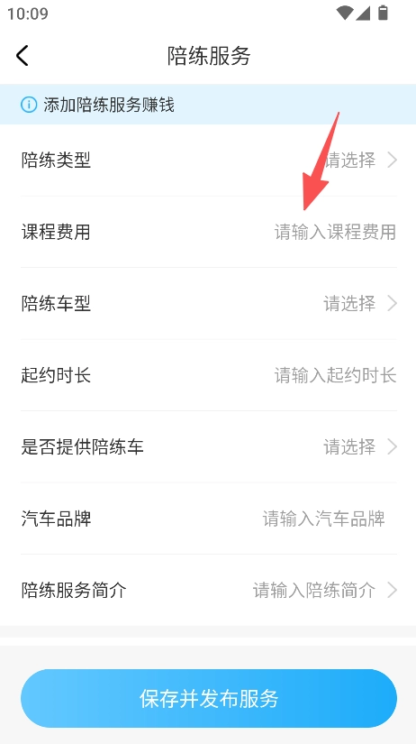 在招生服务板块选择陪练服务,填写陪练类型、费用等相关信息,完成后保存并发布。