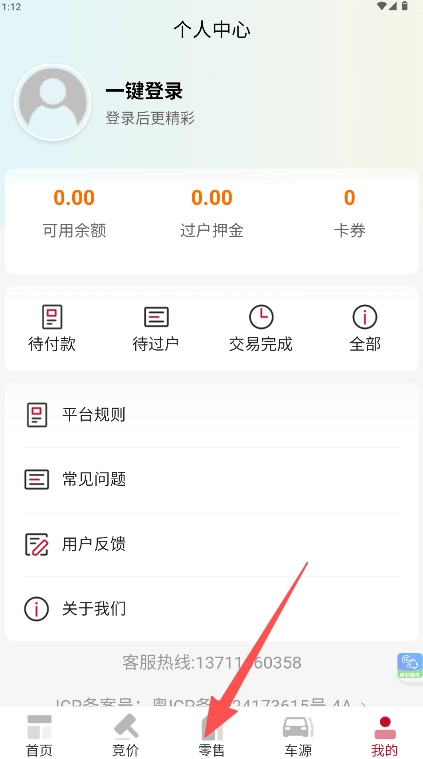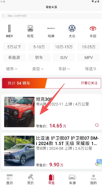 在应用底部的导航栏中找到“零售”按钮并点击,即可进入零售页面查看当前在售的车辆列表。