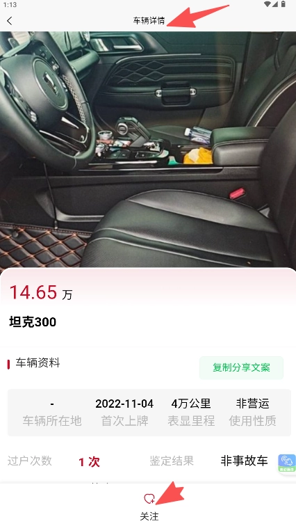 若想了解车辆的具体信息,可前往车辆详情页查看;要是想后续能随时查看该车,点击页面底部的“关注”按钮就能完成收藏。