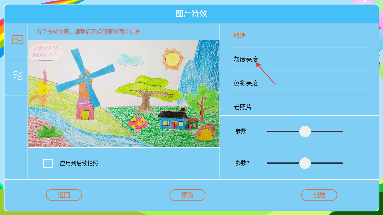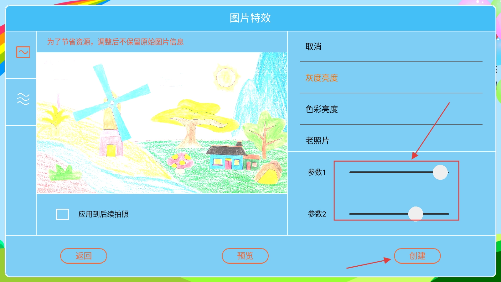 调整好【参数1和参数2】后,点击【创建】按钮,就能完成该图片滤镜特效的设置。