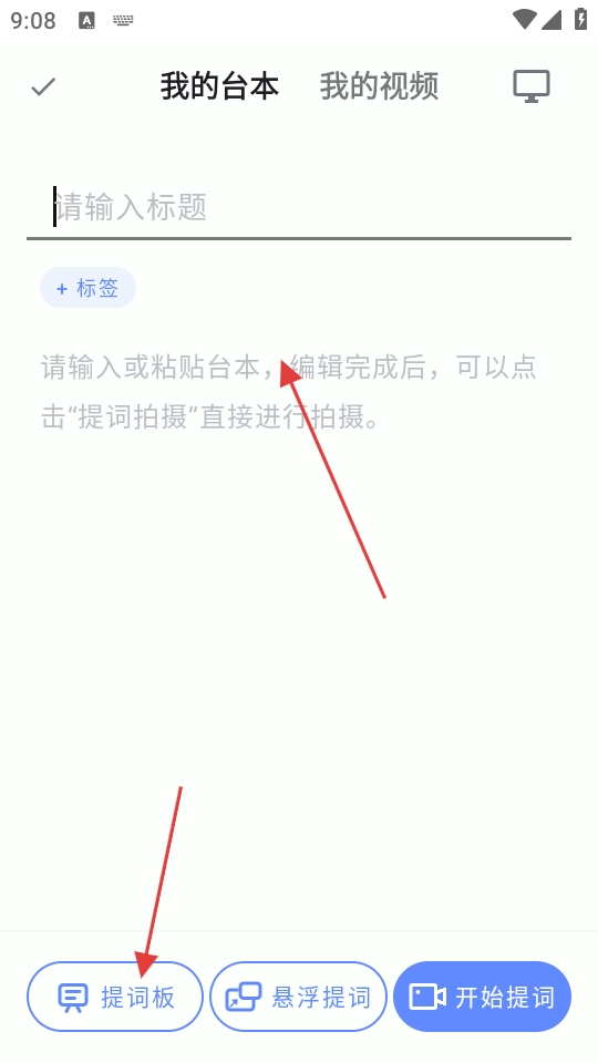 在我的台本页面填写台本标题与内容后,能够选择【提词板】之类的提词模式。