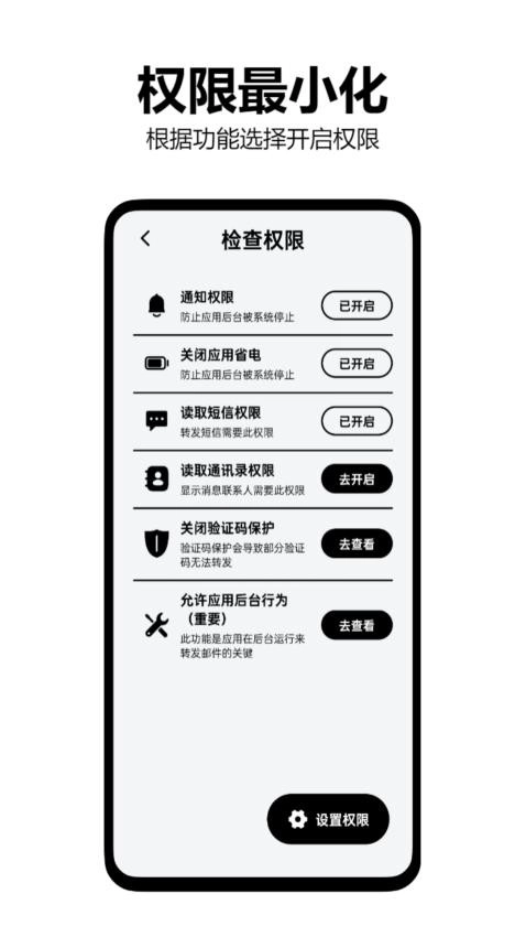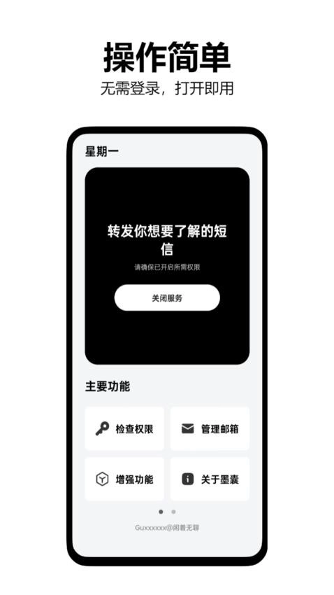 启动墨囊短信转发功能后,点击首页的“开启服务”按钮,以此激活短信监控权限。