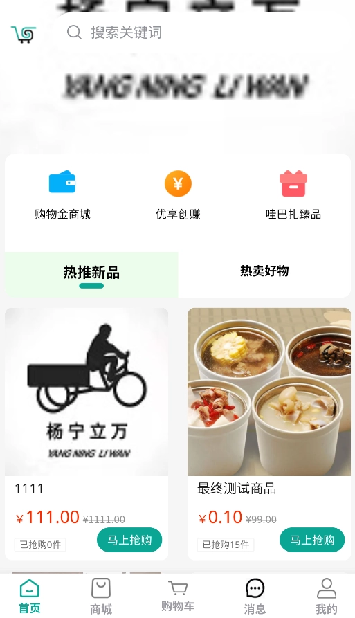 启动哇巴扎后,首页会呈现“购物金商城”“优享创赚”等特色购物专区,用户可在此直接挑选并购买商品。