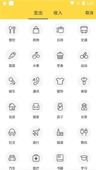2、点击下方的记账加号,选择支出或收入类别,即可完成在线记录。