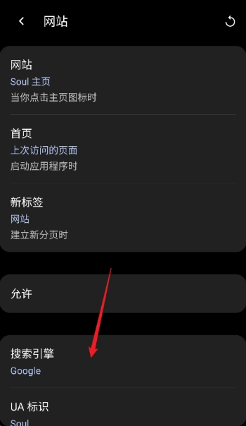 2、进入设置界面后,点击“网站”选项,从中找到“搜索引擎”功能。