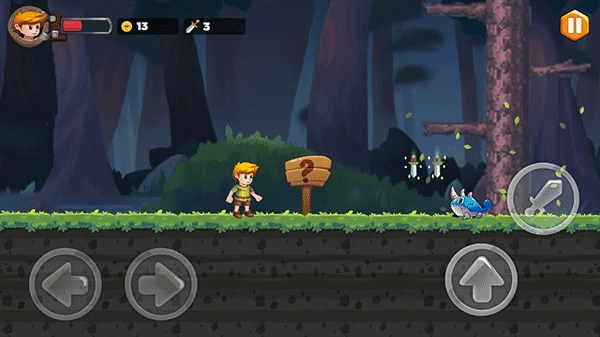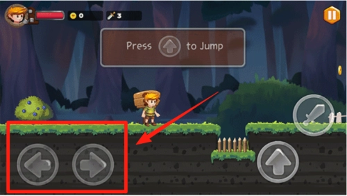 经典的操作方式是:左下角控制左右方向,右下角负责跳跃和领取金币。一旦你获得武器,发射按钮便会显示出来。