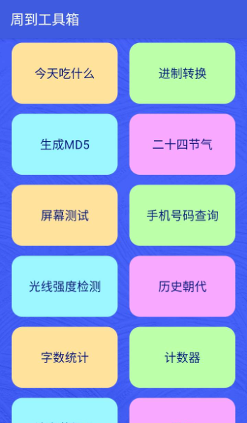 周到工具箱是一款功能非常多的生活实用类软件,它将众多工具收纳到一个中,感觉作者梦到什么加什么似的~不知道今天吃什么?试试它;进制不会算?试试它;想测测屏幕?试试它...内容真的非常多,还有什么字数统计、计数器、历史朝代、二十四节气、生成MD5等等功能。尽管塞了这么多内容进去,它的体量依然没超过50M,一点都不占地方,还不错。