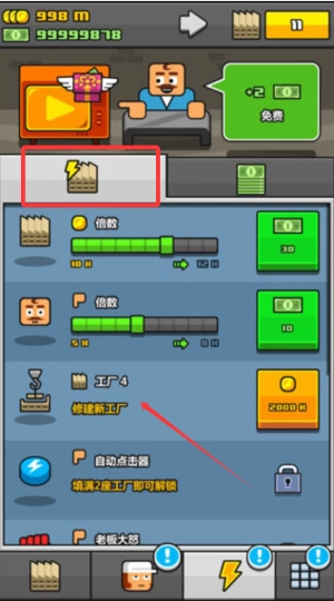 当玩家积累了大量金币并招募了众多员工后,会逐渐意识到让所有员工挤在一个工厂里并不合理,这时便会萌生开设新工厂的念头。此时,玩家只需点击游戏界面下方第三个带有闪电图标的方框,进入相关页面后,就能查看包括修建新工厂所需满足条件在内的各类信息。