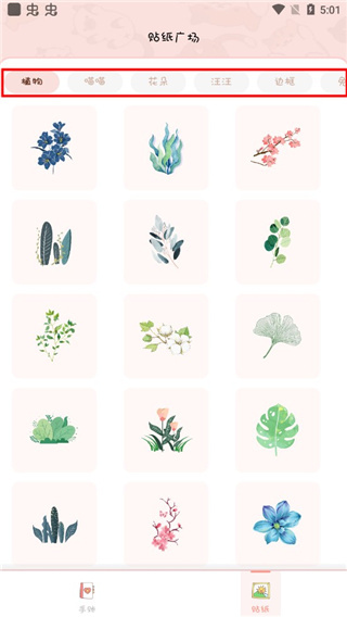5、这里是贴纸广场,平台把贴纸做了细致的分类,大家快来挑选心仪的贴纸制作手账吧!