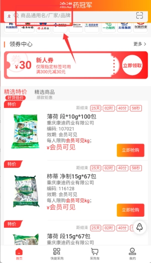 在查询框输入药品名称,筛选所需商品规格与型号。