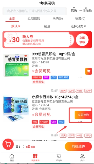 挑选合适的药品规格添加到购物车后,系统会自动显示可参与的拼团活动;在结算环节,您能自主选用已领取的优惠券,从而享受叠加的折扣福利。