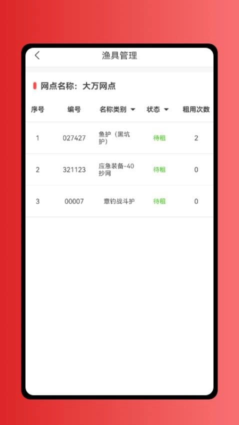 借助“渔具管理”模块,可筛选处于租赁中或闲置状态的设备,点击详情即可查看具体的使用记录,便于后续租赁计划的安排。