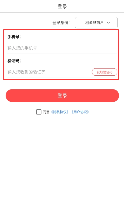 启动租渔具的商户端后,在登录页面点击“切换身份”按钮,即可进入身份选择界面。