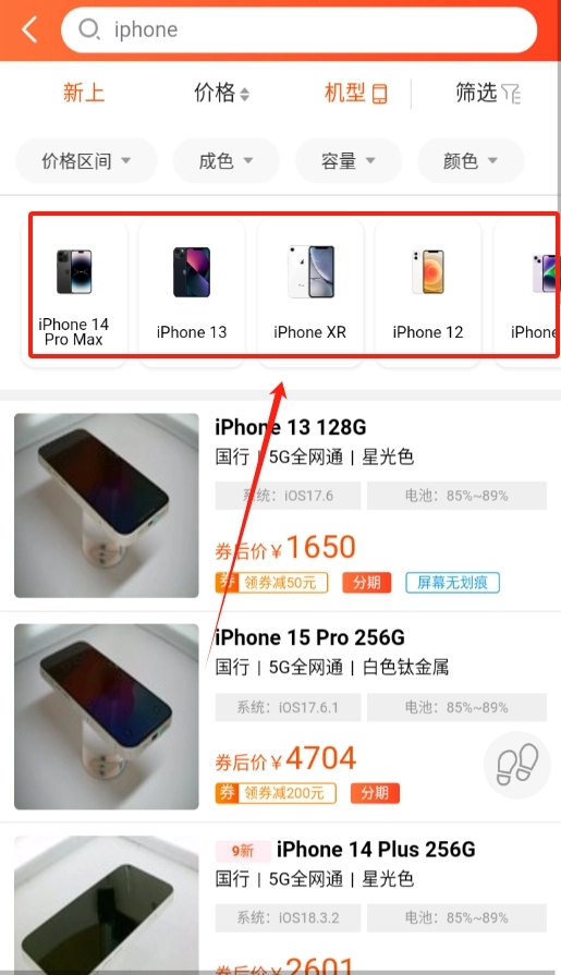 选好品牌后,页面会展示该品牌的多款手机型号,你可以从中挑选出想要购买的那一款。
