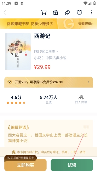 在书籍详情页面,点击【试读】按钮,就能开始阅读这本书籍了。
