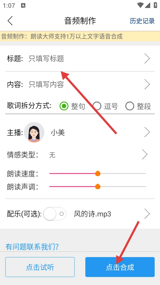 在音频制作界面,填写标题与内容,完成歌词拆分方式、主播等信息的设置后,点击【点击合成】按钮,即可完成音频合成操作。