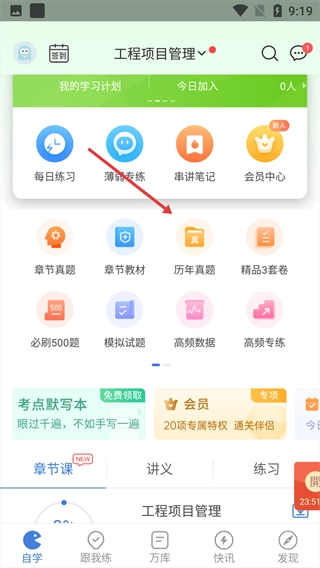 在自学界面,点击“历年真题”选项。