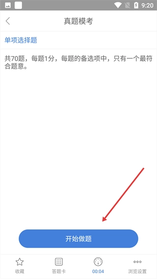 进入真题模考页面后,点击“开始做题”按钮,即可启动答题流程。