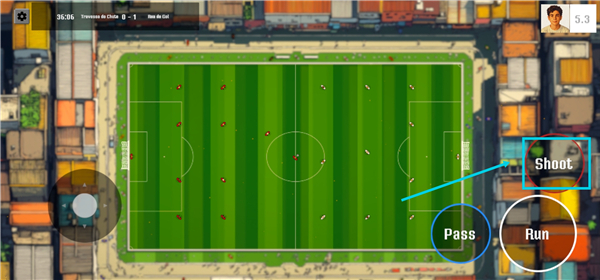 1、进入比赛后,由你率先发球,通过操控左侧遥杆来调整方向,点击【shoot】按钮即可将球踢出。