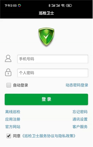 在输入登录账号(通常是手机号码)和登录密码后,点击【登录】按钮,登录成功即可进入巡检卫士客户端(App)的主界面。