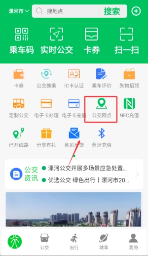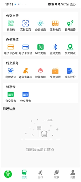 用户点击公交后,既能使用公交出行、办卡充值、线上服务、特惠卡等公交相关服务,也可以查询附近的公交站点。