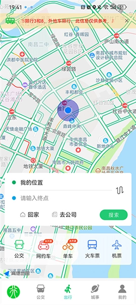用户可在该页面输入自身位置与目的地,系统将自动生成出行方案及路线;此外,还能使用网约车、单车服务,也可完成火车票、机票的购买操作。