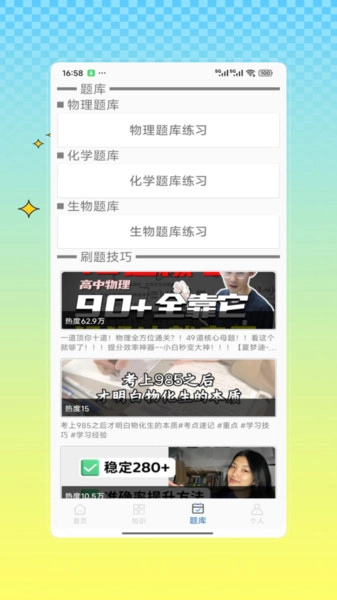 首页会推送大量学习资料,并且支持物理实验与化学实验的搜索学习功能。