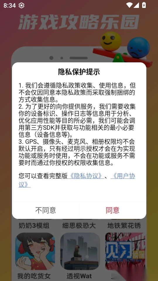 1. 首先打开软件,阅读“隐私保护提示”的内容,确认后点击“同意”按钮进入下一步操作。