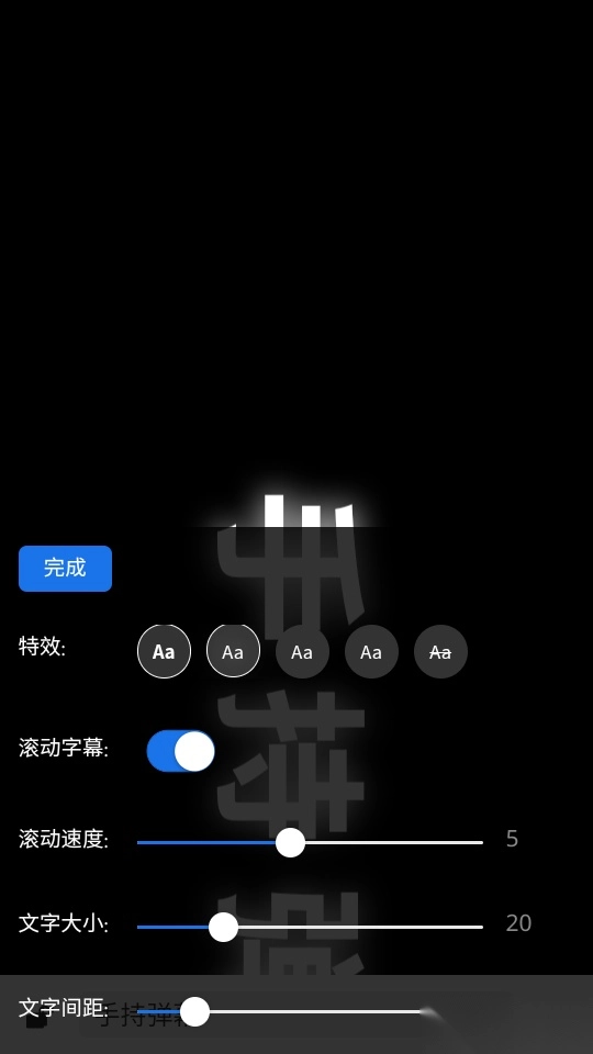 4. 接下来大家设置好特效、滚动字幕的开关、滚动速度、文字大小以及文字间距后,再向下滑动页面。