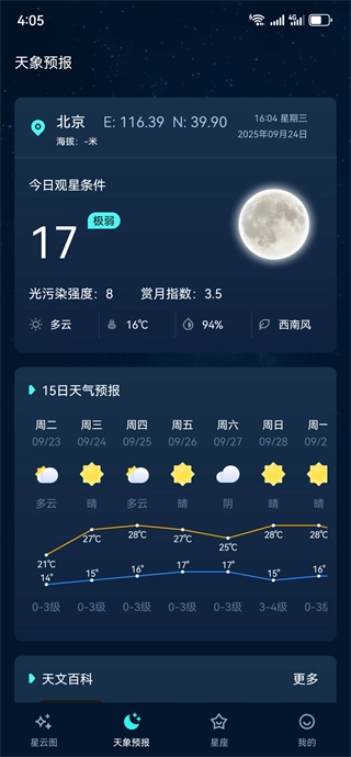 2、除了包含光污染强度、赏月指数这类观星核心指标外,还可提供逐小时的天气预报,助力用户更科学地筛选出适宜观星的时间与地点。