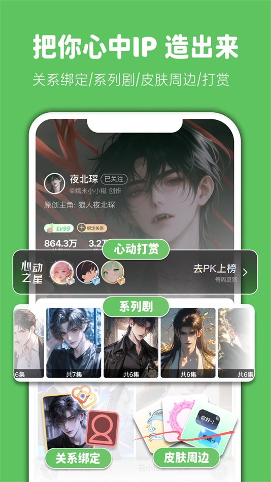 1、把你心中的IP打造出来:关系绑定、系列剧集、皮肤周边、粉丝打赏。