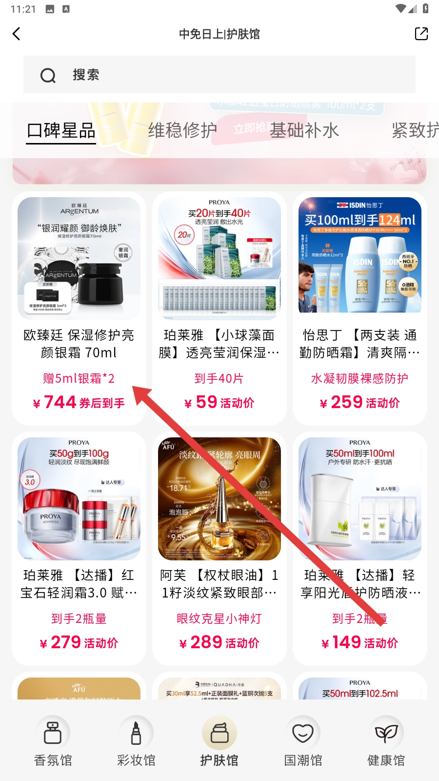 打开首页后,点击【护肤】分类,同样能够查看其他分类的商品。
