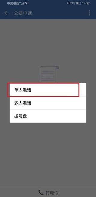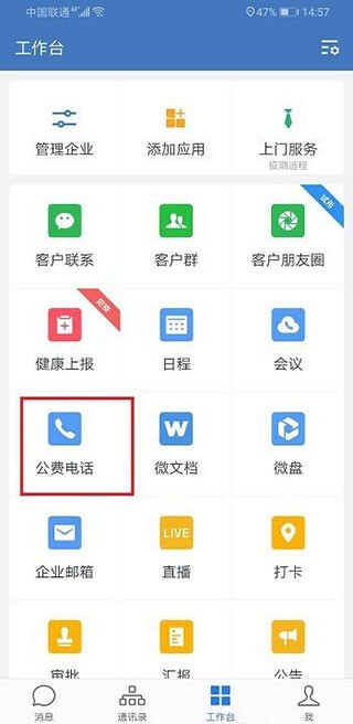 2、接下来我们尝试使用公费电话功能,具体操作是打开企业微信,点击公费电话选项,再选择打电话,操作步骤可参考下图: