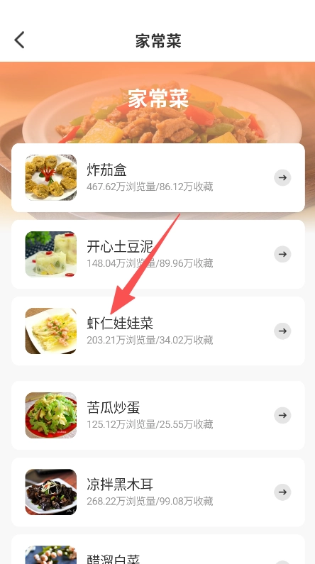 在家常菜列表中点击目标菜谱(如虾仁娃娃菜)。