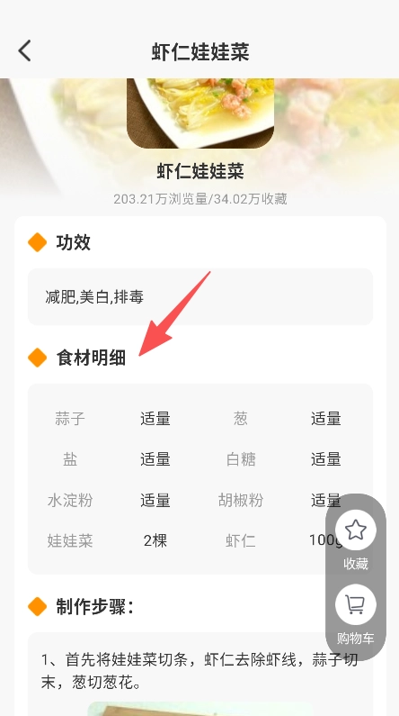 详情页把功效、食材和步骤整合在一起,内容既全面又逻辑清晰,能降低学习做菜的实操难度。