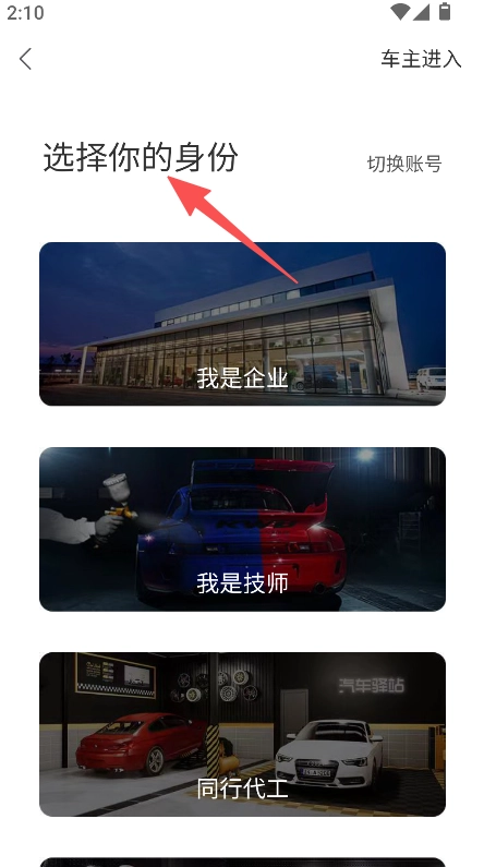 提供身份选择功能,用户可选择企业、技师等身份,进而进入对应角色的汽车服务资源对接页面。