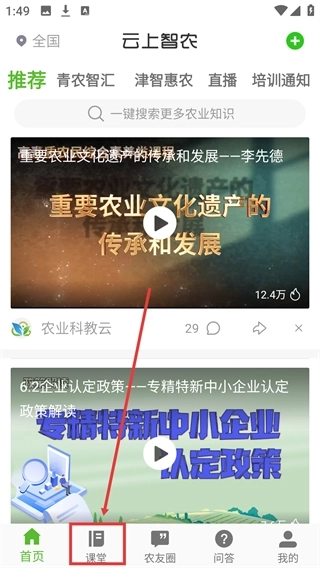 打开【云上智农】应用,在界面底部的导航栏中找到标有【课堂】字样的按钮,点击该按钮即可进入与课程相关的页面。