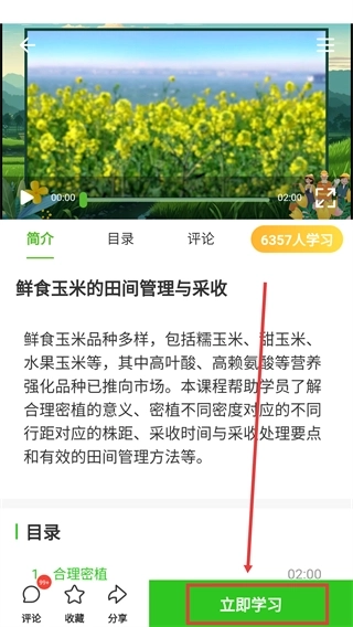 点击课程进入详情页面,查看《鲜食玉米的田间管理与采收》的简介内容后,点击页面底部的【立即学习】按钮。