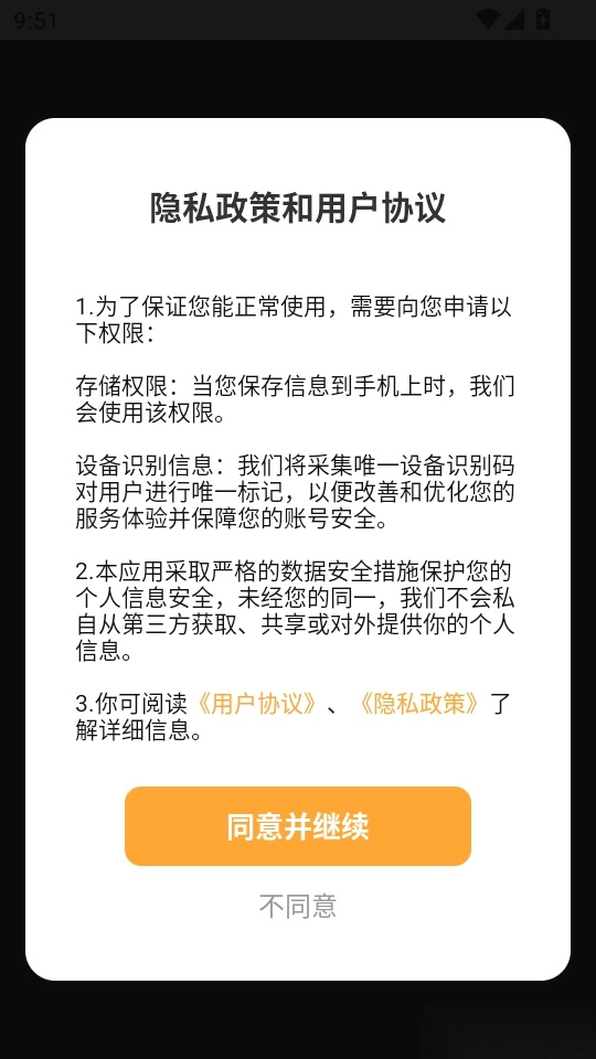 1. 首先打开软件,仔细阅读隐私政策与用户协议,确认无误后点击“同意并继续”按钮以启动软件
