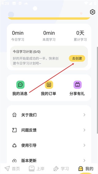 进入“我的”页面后,找到【今日学习计划-(0/0)】模块旁边的【去创建】按钮。