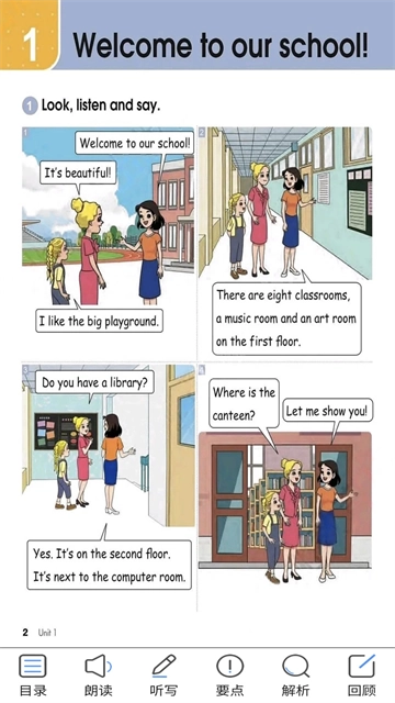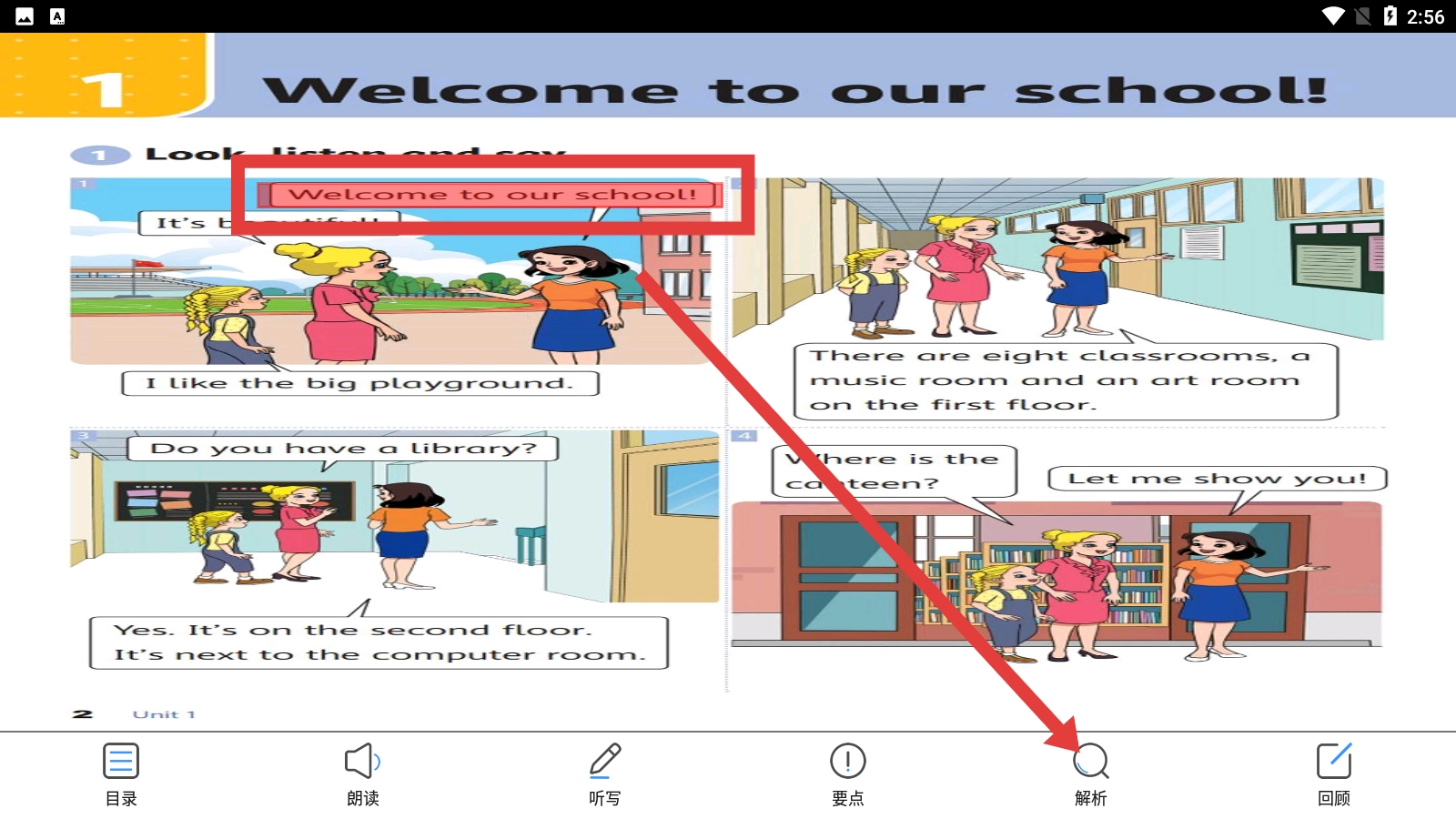 进入课文页面后,点击【Welcome-to-our-school!】相关内容,再点击页面底部的【解析】按钮,就能查看该课文的解析内容了。