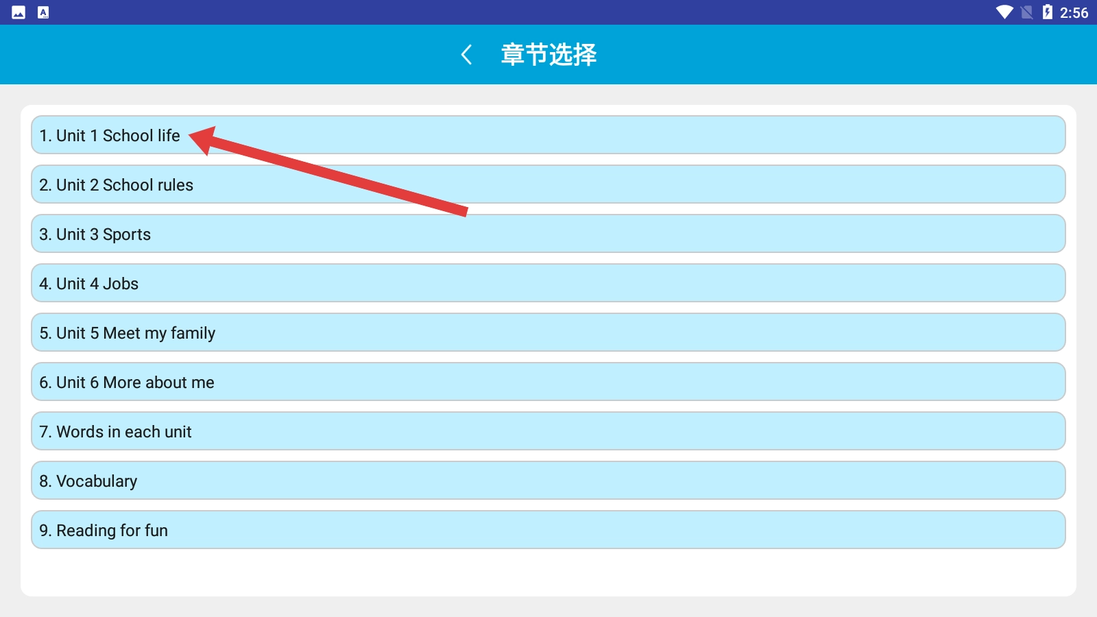 在章节选择界面,你可以点击【Unit-1-School-life】这类单元选项,来选择想要学习的章节内容。