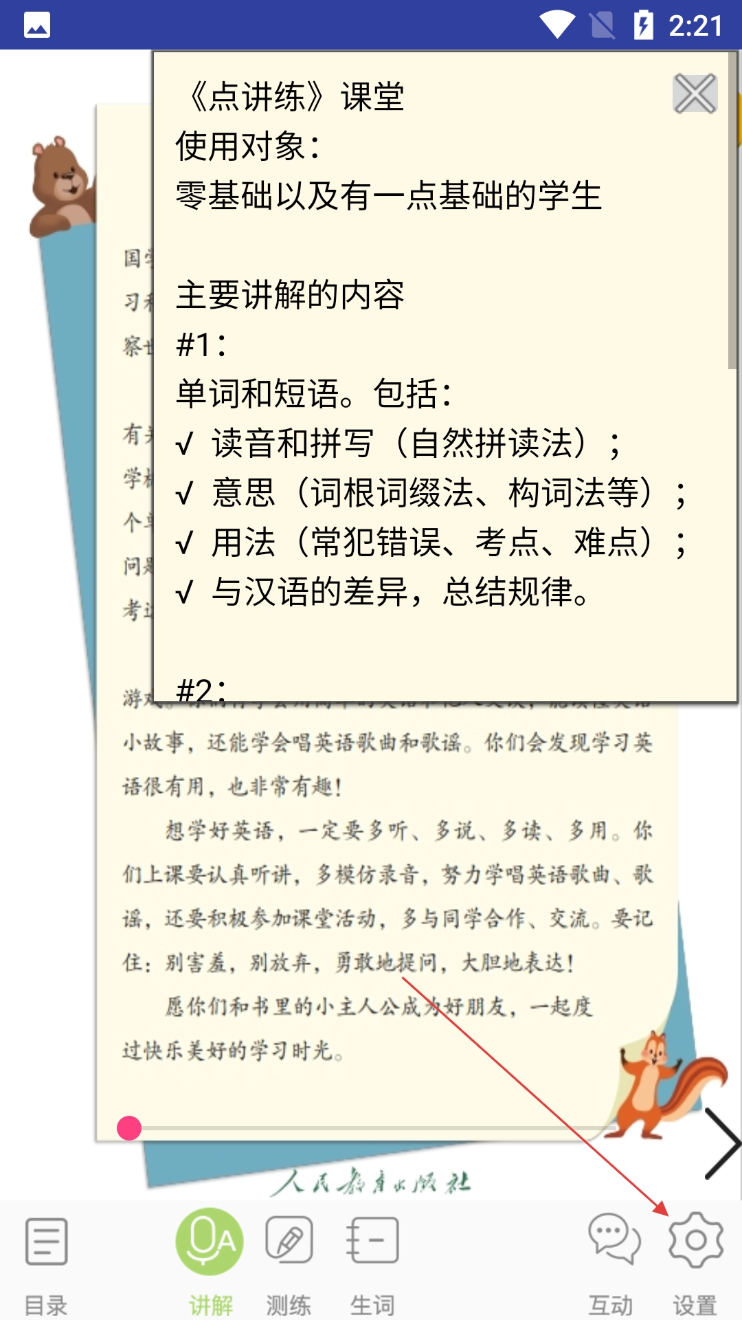 完成课本内容后,打开书本,接着点击底部的【设置】选项,即可进入点读设置页面。
