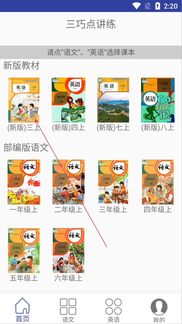 在首页点击【(新版)三上】英语课本,进入提示页面。