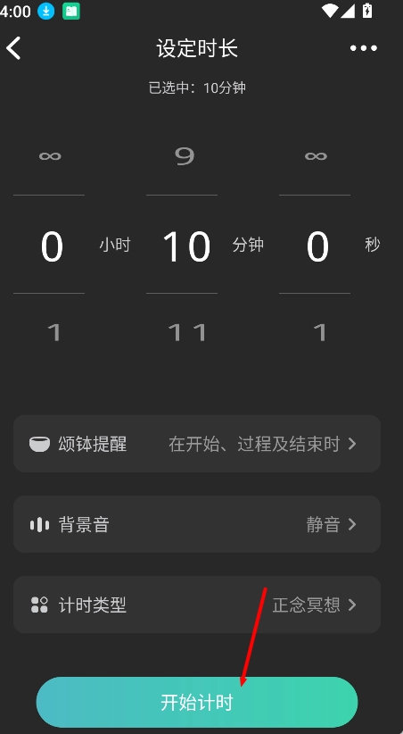 在冥想设置界面里,把冥想时长设置成10分钟,并且要确认计时功能处于开启状态。