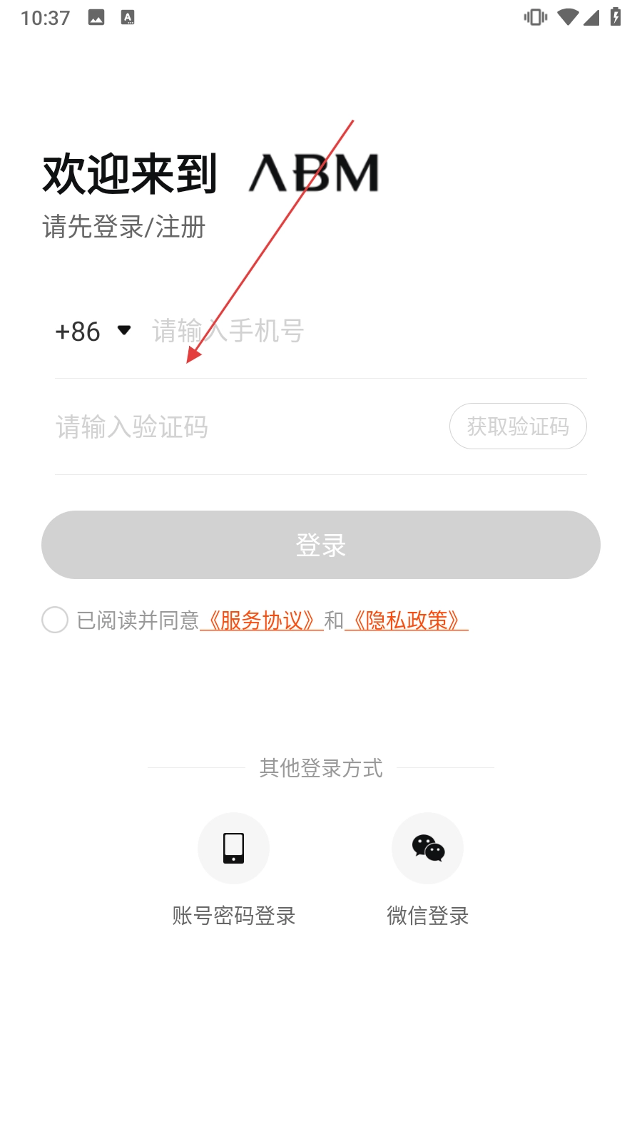 打开ABM应用后,进入登录与注册界面。在“请输入手机号”的输入框中填写你的手机号码。