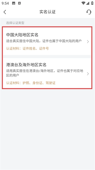 进入【实名认证】页面后,你可以选择【中国大陆地区实名】或者【港澳台及海外地区实名】这两种认证类型,然后准备好对应的材料来完成认证流程。